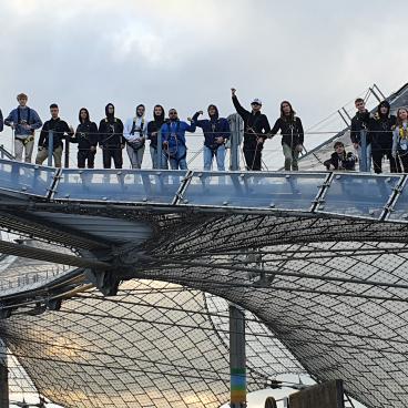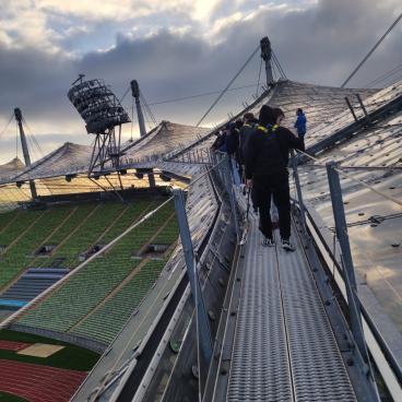 Mittwochvormittag folgte das nächste Highlight, die Bavaria Filmstudios, wo unter anderem die Studios der Filme „Asterix & Obelix“, „Das Boot, „Hui Buh, „The Flute“ und nicht zuletzt in das Klassenzimmer von Lehrer Zeki Müller von „Fack ju Göthe“ besichtigt werden konnten. Nach diesem Ausflug ins Hollywood Deutschlands ging es hoch hinaus – auf das Zeltdach des Olympiastadions. In der herbstlichen Abendstimmung, mit Sicherheitsgurten gesichert, marschieren die Schüler:innen über die Zeltdachkonstruktion bis auf die Spitzen hinauf und genossen den Blick auf die Dächer der Großstadt. Donnerstags wurde noch das Deutsche Museum mit vielen interessanten Ausstellungen besichtigt, in welchem manche Schüler:innen bis zum Nachmittag hinein verweilten - ein ruhiger Ausklang, bevor es freitags wieder heimwärts ging.